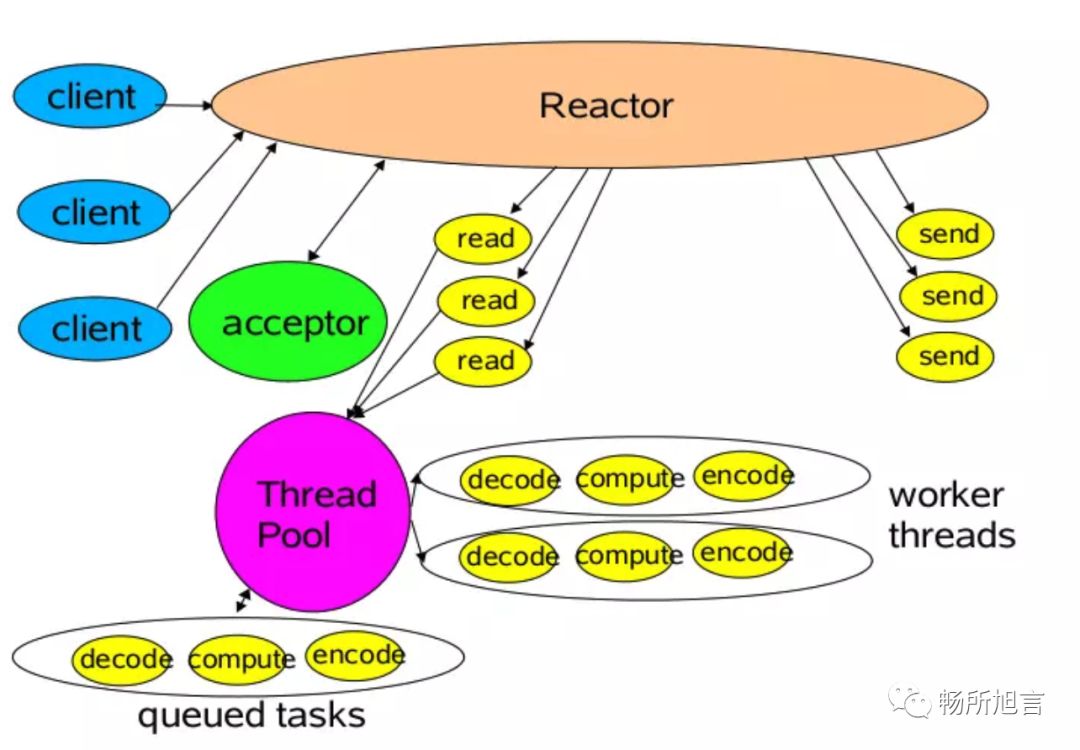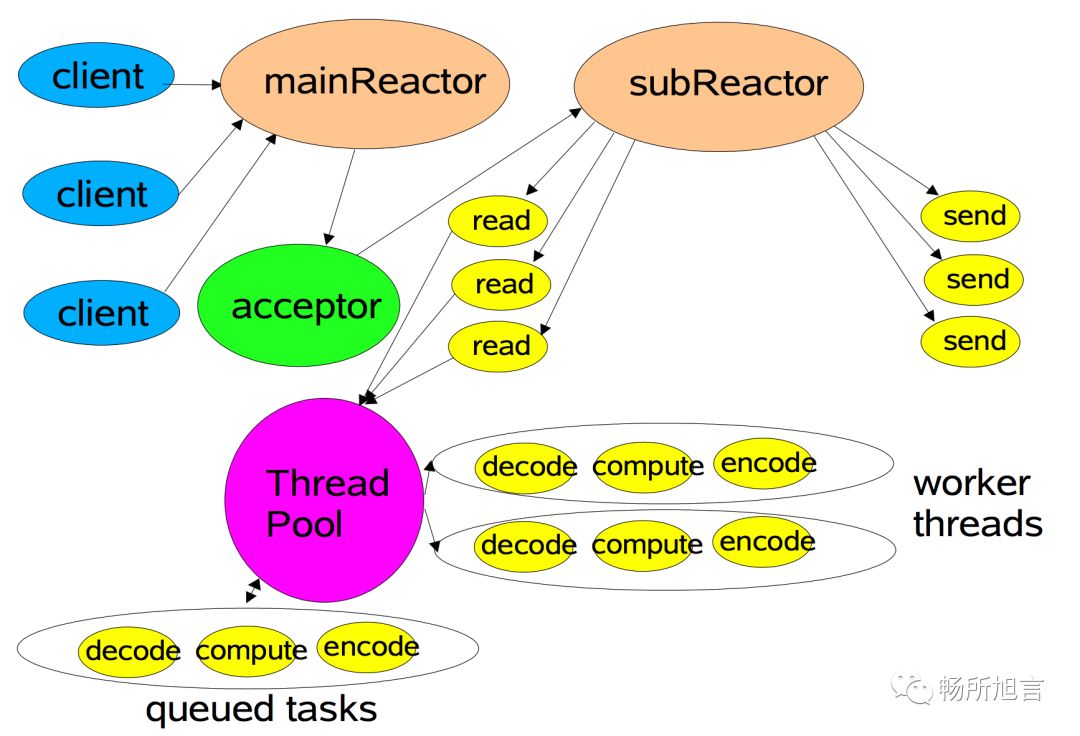acceptor 是一个独立的模块在代码的实现他就是一个线程(当然也可以是一个线程池) 一个ThreadPool 线程池用来进行数据编解码 我们称作工作线程 这两个模块交由reactor 统一的管理与分发 ,reactor 负责监听客户端是否 可 read/write ,发现可以IO则交由 worker thread 去处理