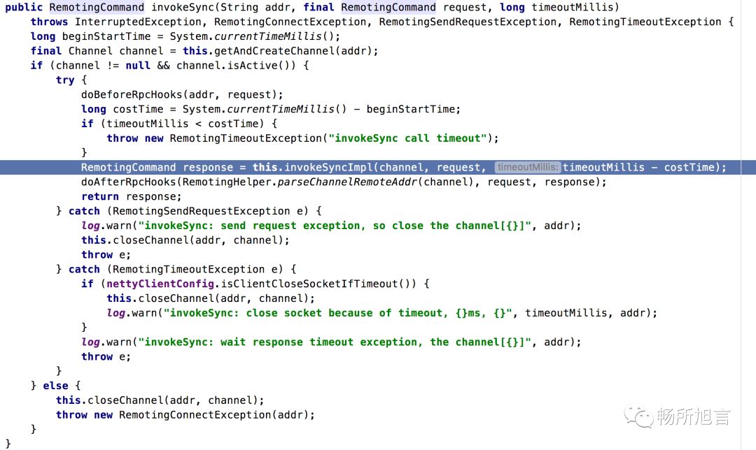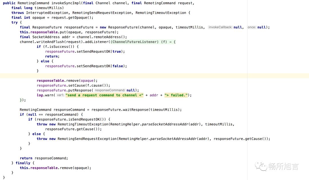 invokeSyncImpl 方法是在 NettyRemotingAbstract 里面,它是NettyRemotingClient 的父类 这里也透露了一些设计模式,就是把一些公共通用的代码可以向上他的父类进行抽象 (模板)