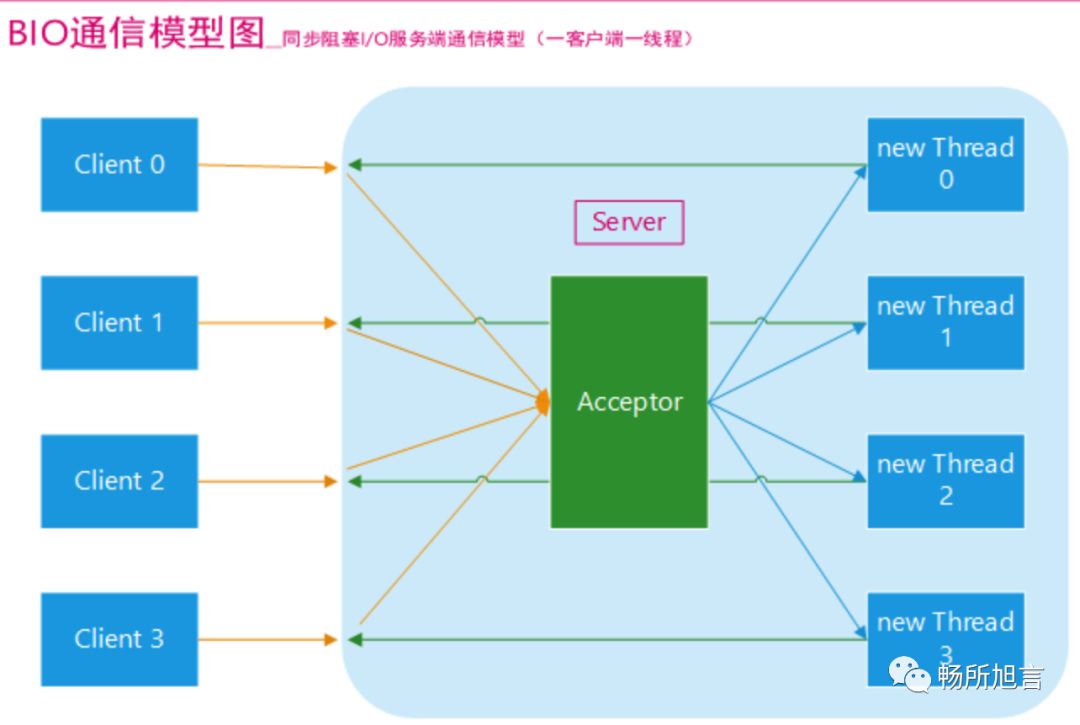 采用 BIO 通信模型 的服务端,通常由一个独立的 Acceptor 线程负责监听客户端的连接。我们一般通过在 while(true) 循环中服务端会调用 accept() 方法等待接收客户端的连接的方式监听请求,请求一旦接收到一个连接请求,就可以建立通信套接字在这个通信套接字上进行读写操作,此时不能再接收其他客户端连接请求,只能等待同当前连接的客户端的操作执行完成, 不过可以通过多线程来支持多个客户端的连接,每个客户端一个线程就是上图所示,但是这里有一个问题就是如果客户端的很多我们需要开启很多线程然后操作系统对线程的个数是限制的,以及在调度过程中很多线程也会导致上下文切换效率不高,所以该模型有的局限性,为了能够支持多个客户端进行通信我们就引入了多路复用的机制