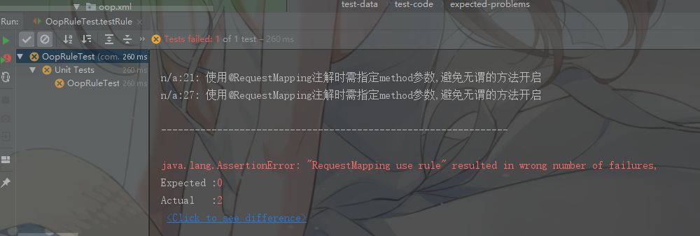 运行单元测试,因为样例代码中21、27行不符合规范,但是我们预期问题个数写的是0,所以单元测试会不通过: