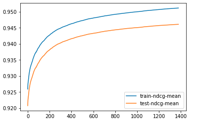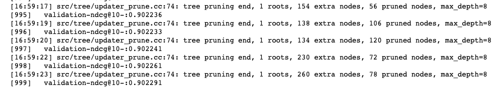 train_dmatrix = DMatrix(x_train, y_train)valid_dmatrix = DMatrix(x_valid, y_valid)test_dmatrix = DMatrix(x_test)train_dmatrix.set_group(group_train)valid_dmatrix.set_group(group_valid)test_dmatrix.set_group(group_test)params = {'objective': 'rank:pairwise', 'eta': 0.5, 'gamma': 1.0, 'min_child_weight': 0.5, 'max_depth': 8,'eval_metric':'ndcg@10-','nthread':16}xgb_model = xgb.train(params, train_dmatrix, num_boost_round=1000, evals=[(valid_dmatrix, 'validation')])