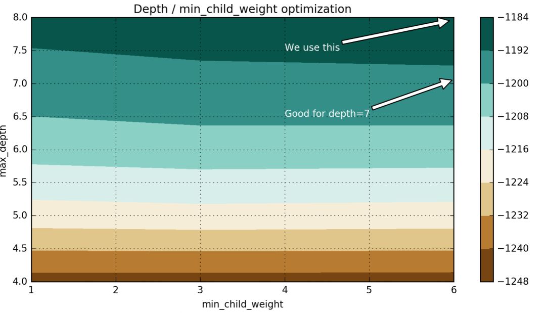 我们看到,从网格搜索的结果,分数的提高主要是基于max_depth增加。min_child_weight稍有影响的成绩,但是min_child_weight = 6会更好一些。