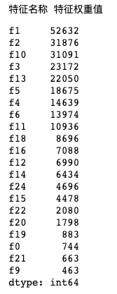 import pandas as pd print('特征名称', '特征权重值')feature_score = xgb_model.get_fscore()pd.Series(feature_score).sort_values(ascending=False)