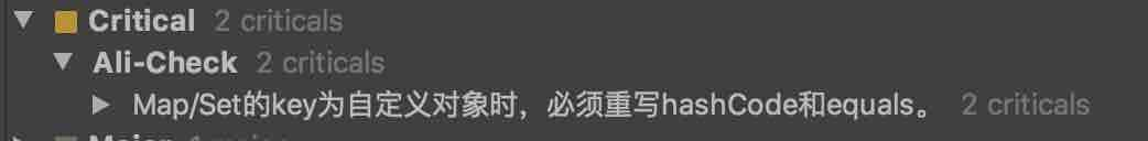 好了,这时候我收到了阿里代码扫描插件的严正警告:如果自定义对象做为Map的键,那么必须重写hashCode和equals。