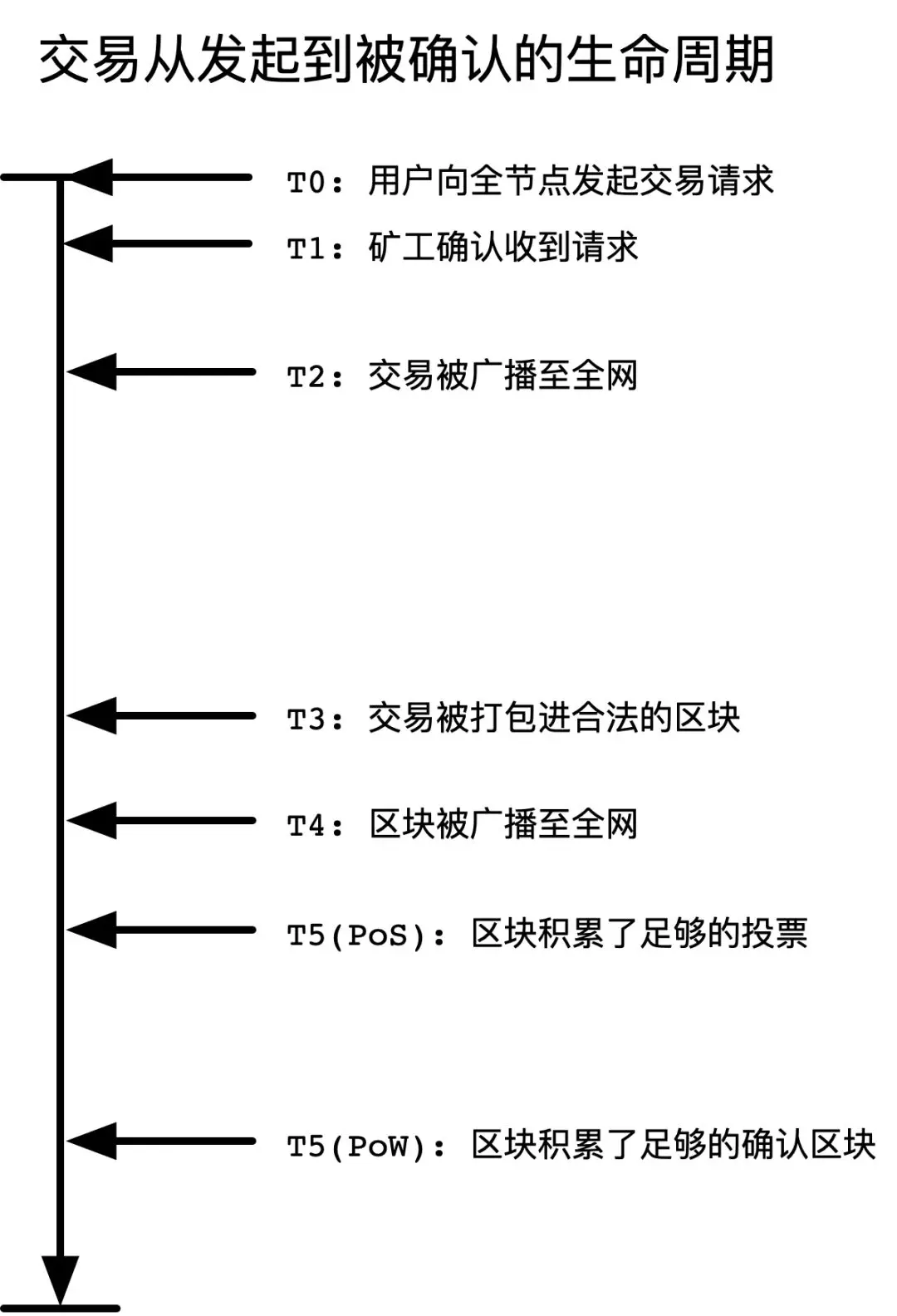 在上图中,T0 时刻,用户向一个或几个矿工节点发起一笔交易的请求;矿工们在 T1 时刻确认收到了这笔交易;随后,这笔交易被广播到了全网(T2),但它需要等到一个矿工将其打包进入合法的区块才可以(T3)。交易进入的区块,在 T4 时刻被广播到全网,等待一段时间后被确认(T5)。