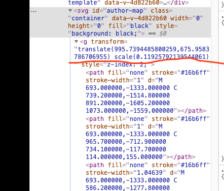 这个需求有点类似于百度地图,搜索出对应结果,点击后屏幕自动移到中间,让使用者清楚的知道该点在整张图的位置,增强用户体验。接到这个需求的时候,我分析了一下页面的dom结构,可以看出整个图的缩放和平移控制是由g元素的transform来控制的,见dom结构树: