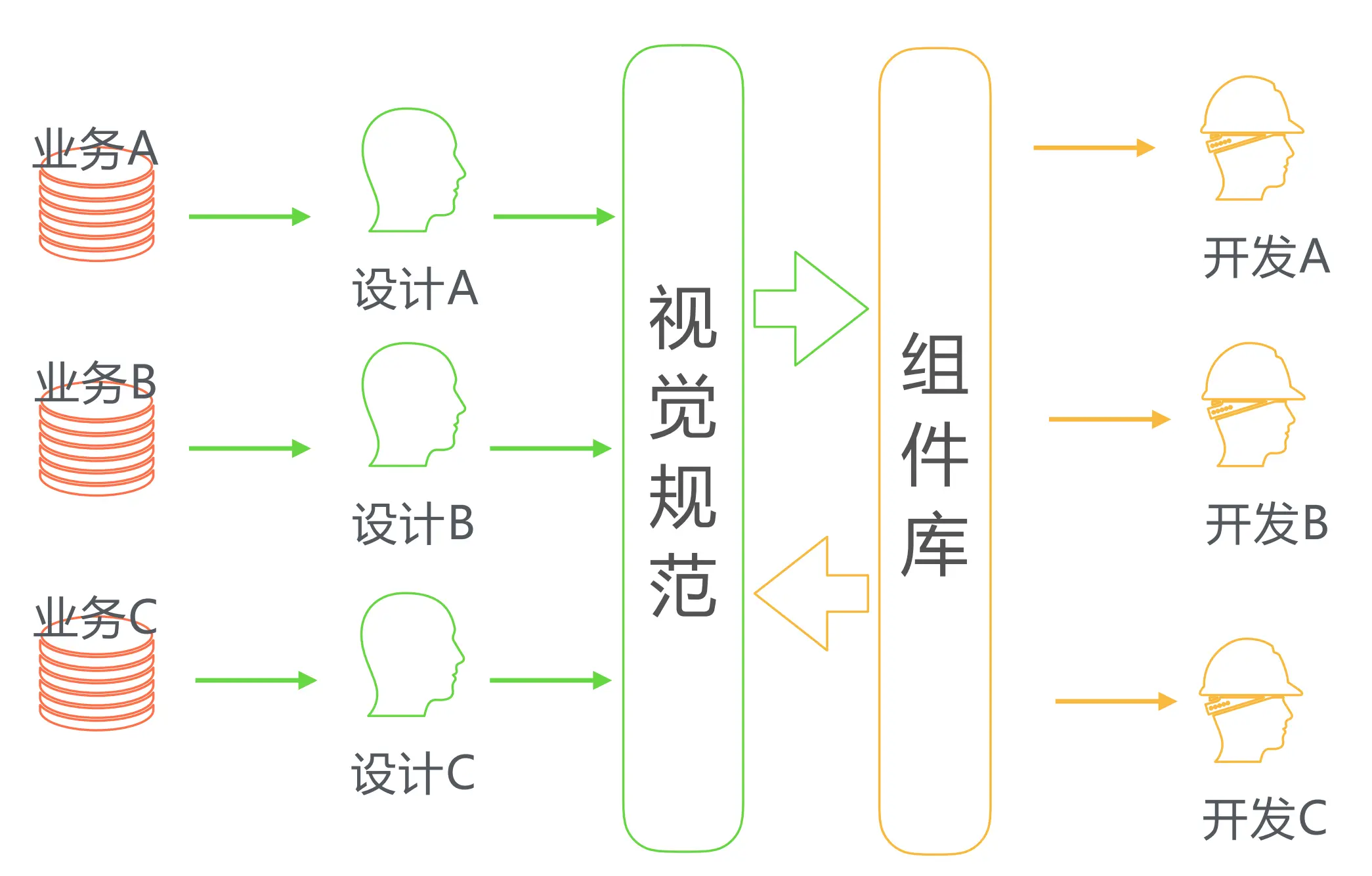 在这个阶段,不同的业务、设计团队共同合作,制定视觉规范,从而沉淀通用的组件库,这样不同业务的开发同学就能够采用组件库实现标准统一的业务样式。