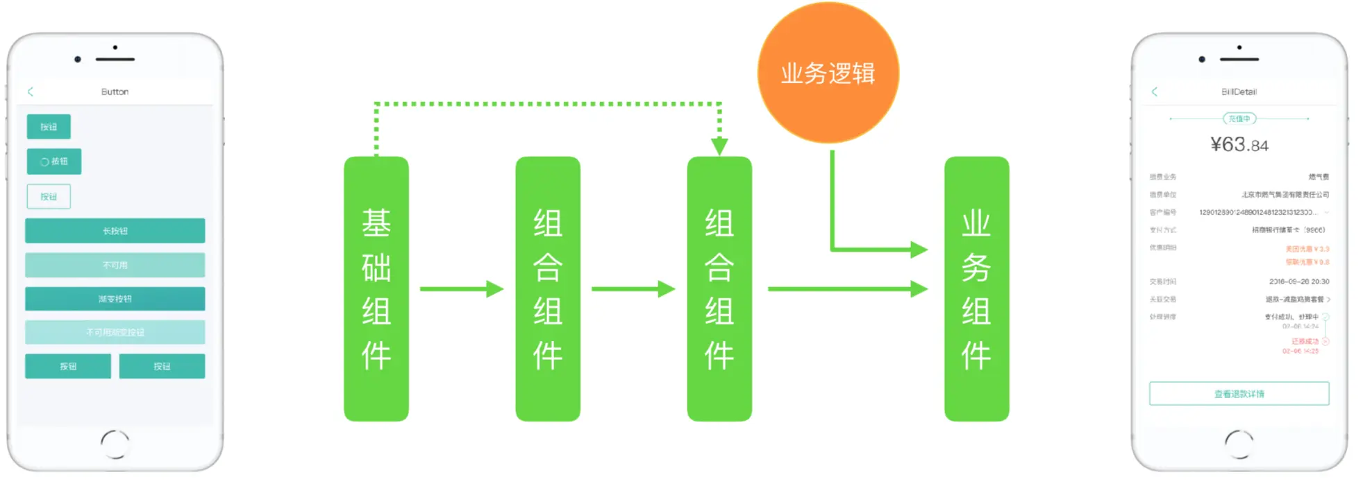 通过对功能点的梳理抽象出一个个原子单元组件,保证每个单个组件职责单一,组件对外接口一致。然后可以通过对组件进行组合,并且赋予业务逻辑形成业务组件。