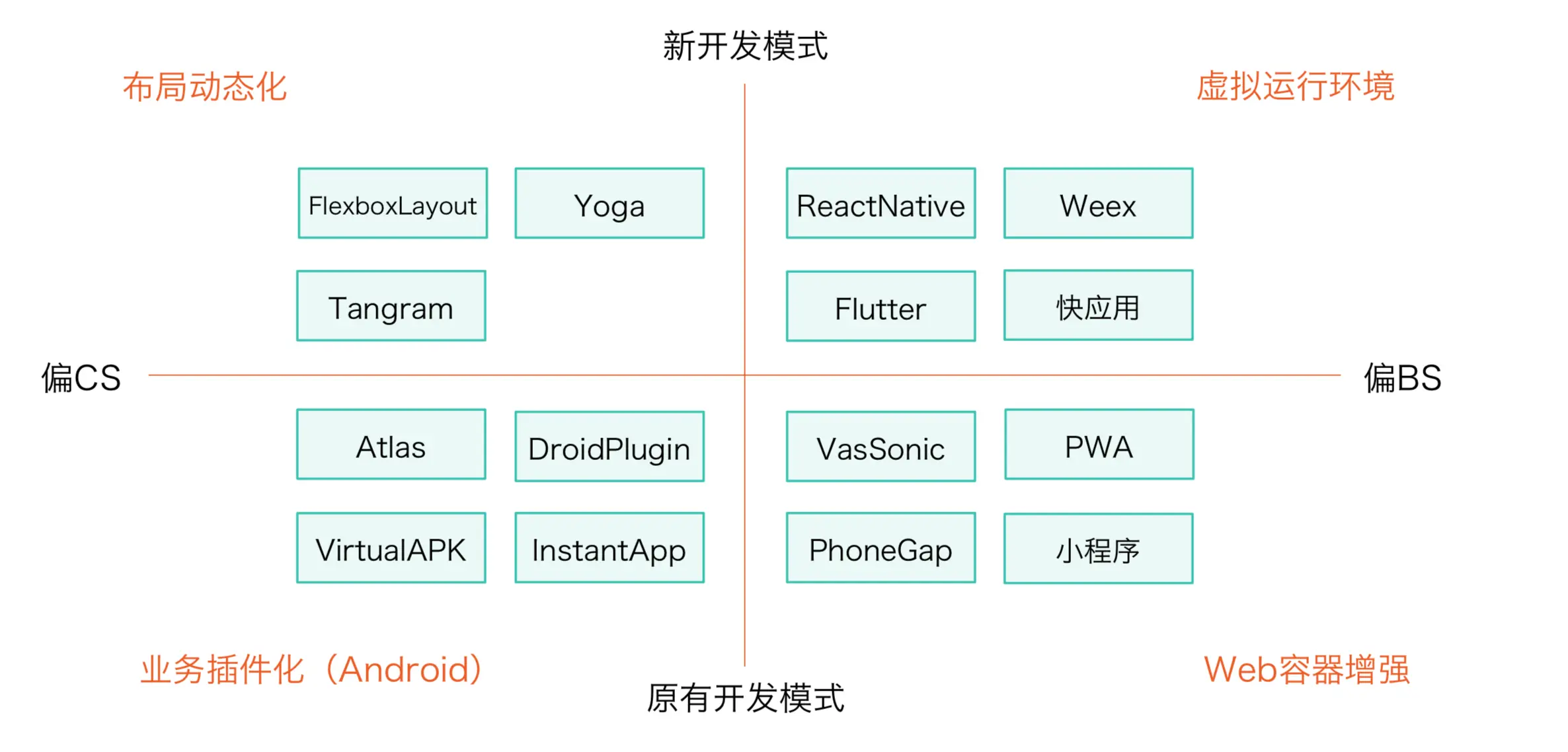 将业界主流的跨平台方案整理一下,大致分为四个类别: