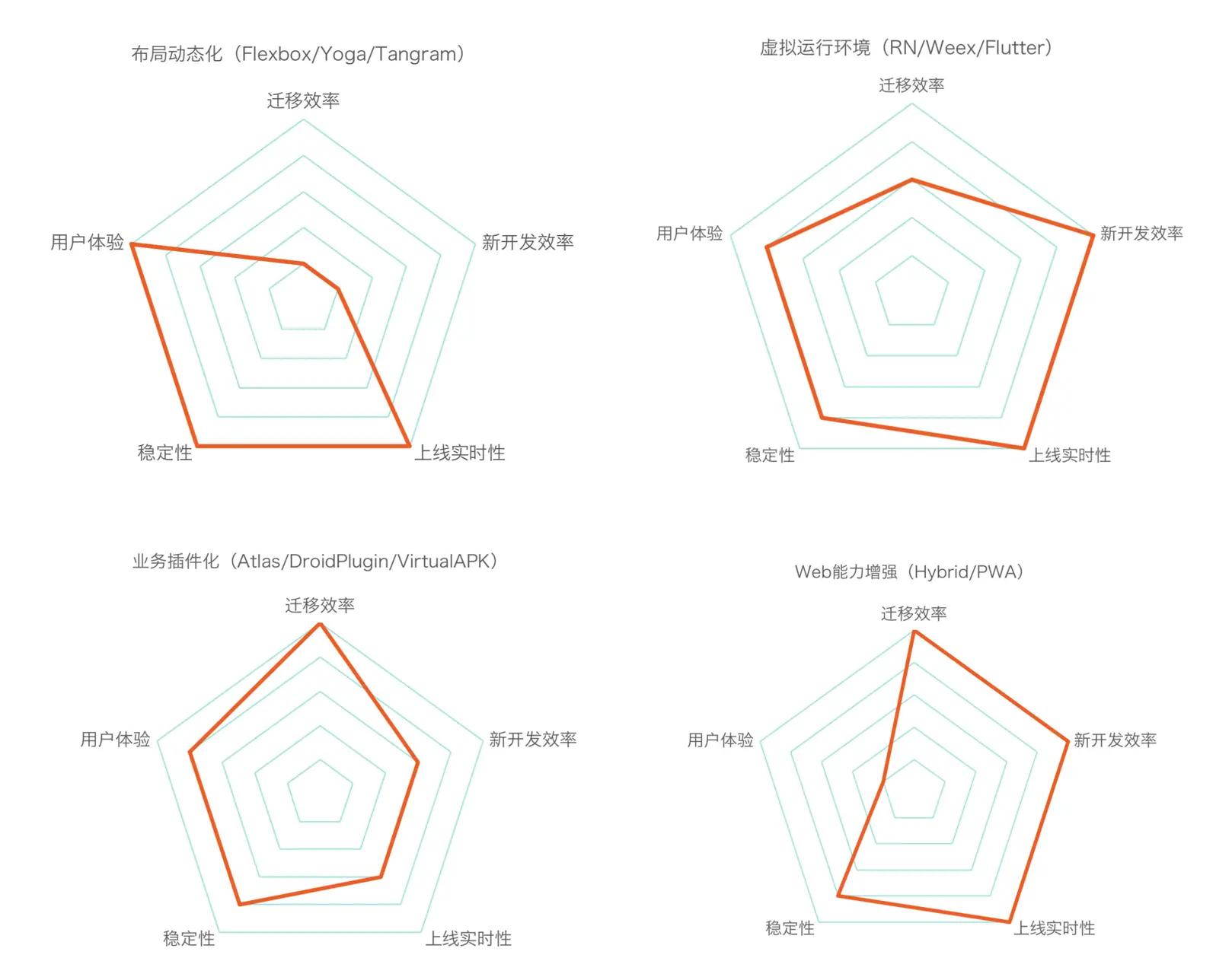 在跨平台、动态化方案中并不存在银弹,每个方案都存在一定的取舍,下图就总结了各个方案在用户体验、稳定性、上线实时性、开发效率和迁移效率五个方面的对比总结: