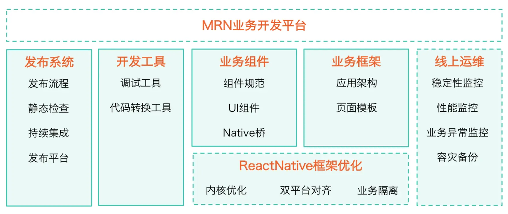 MRN-Meituan Reative Native,顾名思义可以知道这是美团基于RN框架进行封装优化的一个跨端动态化框架,下图可以看到MRN的整个周边设施建设: