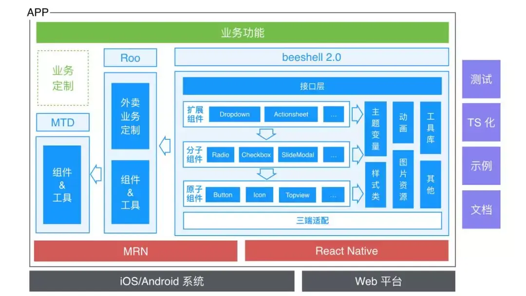 工具层。与 beeshell 1.0 相比,工具更加完备。不但新增了树形结构处理器、校验器等;而且工具的独立性更强,与组件完全解耦,与组件配合实现功能。 这样,一方面,使得组件实现更加简洁,提升了组件的可维护性;另一方面,可以将工具提供给用户,方便用户开发,提升组件库的功能性、易用性。而且,工具与组件的解耦遵循“关注度分离”的原则。 三端适配。RN 在整体上实现了跨平台,iOS、Android、Web 三端使用一套代码,但是在一些细节方面,例如:特殊 API 的支持、相对位置计算等,各个平台有较大差异。为了更好的支持三端,保证跨平台稳定性,还需要在这一层做很多适配工作。
