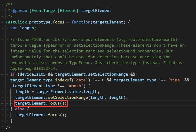 在 /node_modules/fastclick/lib/fastclick.js文件中找到focus方法添加一句代码 targetElement.focus(); 如下图:```