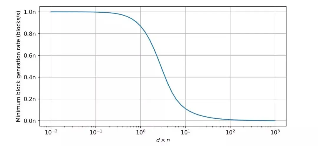 可以看到,在dn的取值非常小的时候,要求的最近算力接近每秒 n 个区块,也就是全体好人的区块生成速率。此时,对平衡攻击的要求不比双花攻击低。当 dn 的取值非常大的时候,要求的算力趋近于0。