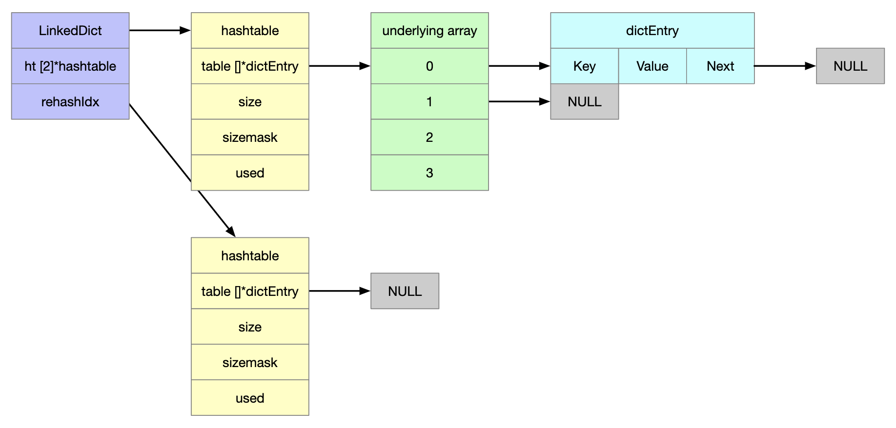 - 有2个bucket,其中0号bucket是最常用的,而1号只会在rehash过程中使用,一旦rehash完成,便不再使用。