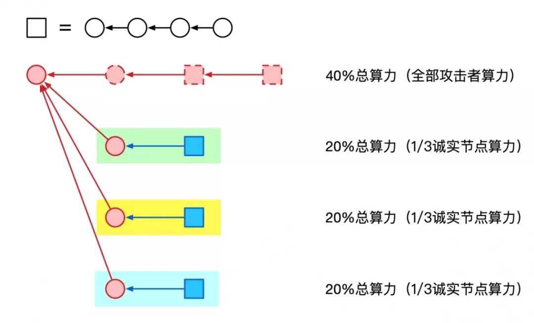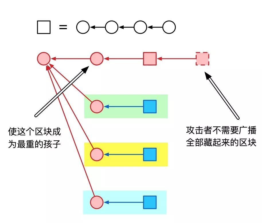 这样攻击者藏的链就会越来越长。而且,这条链上的每一个区块最终还会成为所有诚实节点所认可的主链。也就是说,攻击者用藏了很久的区块控制了主链。