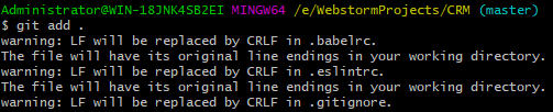 warning: LF will be replaced by CRLF in .babelrc.并不影响工程,只是一个警告,因为Windows下line separator是(\r\n)也就是CRLF,Unix与OS X下是(\n)也就是LF。 - 用命令
