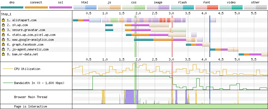 如果你不能自托管第三方脚本,那么最好是预先连接到托管它们的服务器。WebPageTest 的连接视图非常出色地向你展示了网站从哪些服务器收集资源,以及与这些服务器建立连接所需的延迟。