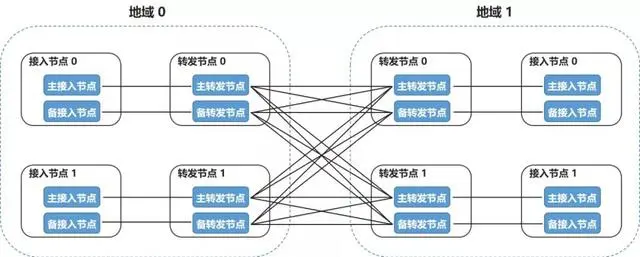 以地域 0-> 地域 2 为例,地域 0-> 地域 2 的可用路径有地域 0-> 地域 1-> 地域 2 和地域 0-> 地域 3-> 地域 2,每两邻接地域的主备转发节点均互连,即:两邻接地域的 link 有 4 条。