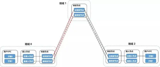 以地域 0 为例,如下图,用户 VPC——> 接入点 VPC——> 转发点 VPC 为打通状态,默认分别与主节点相连,在接入节点为用户 VPC 创建 TC 规则,接入节点与转发节点通过隧道封装报文。