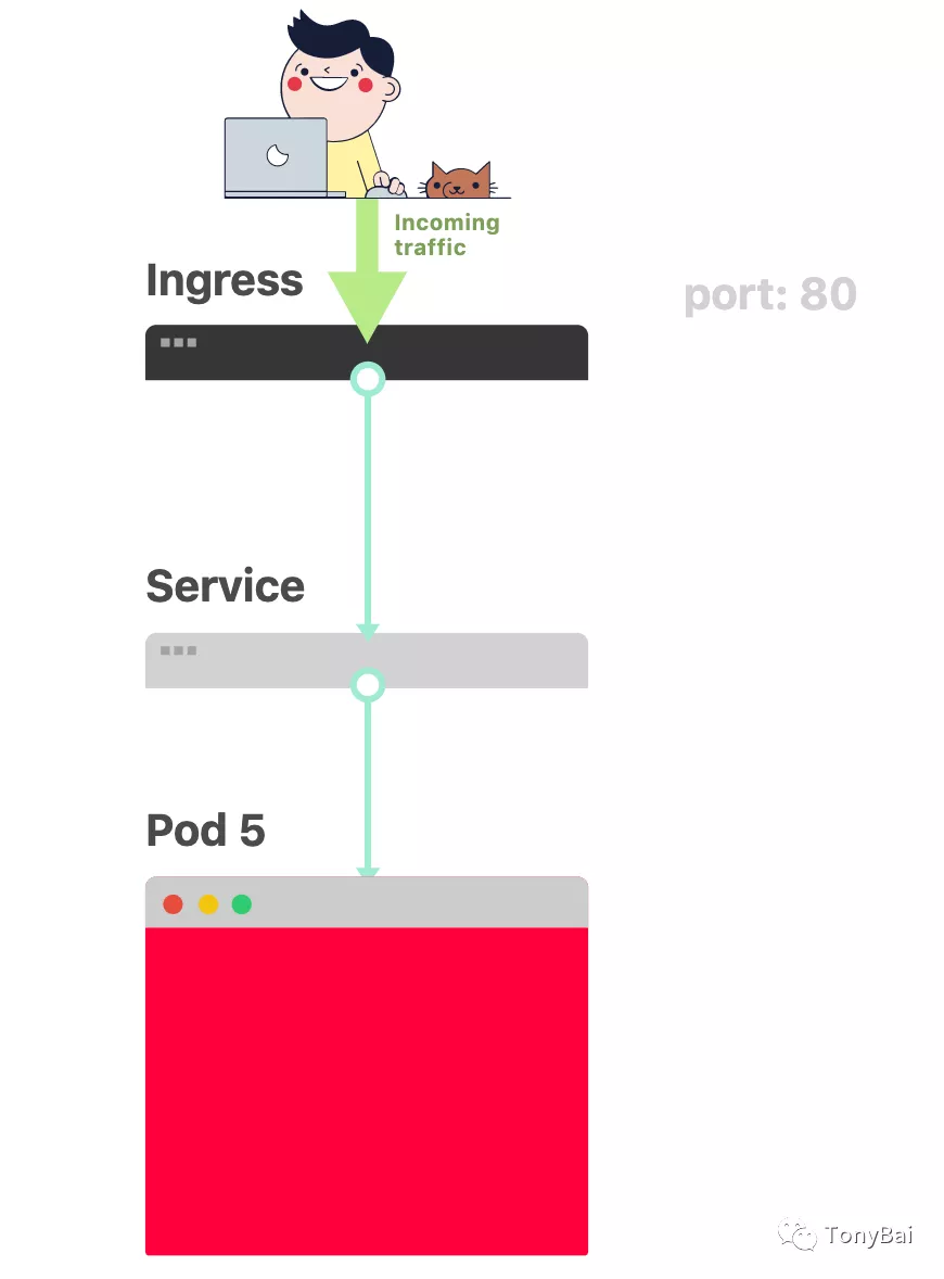 你如何测试Ingress是否正常工作呢? 你可以使用与以前相同的策略kubectl port-forward,但是这次你应该连接到Ingress控制器,而不是连接到Service。