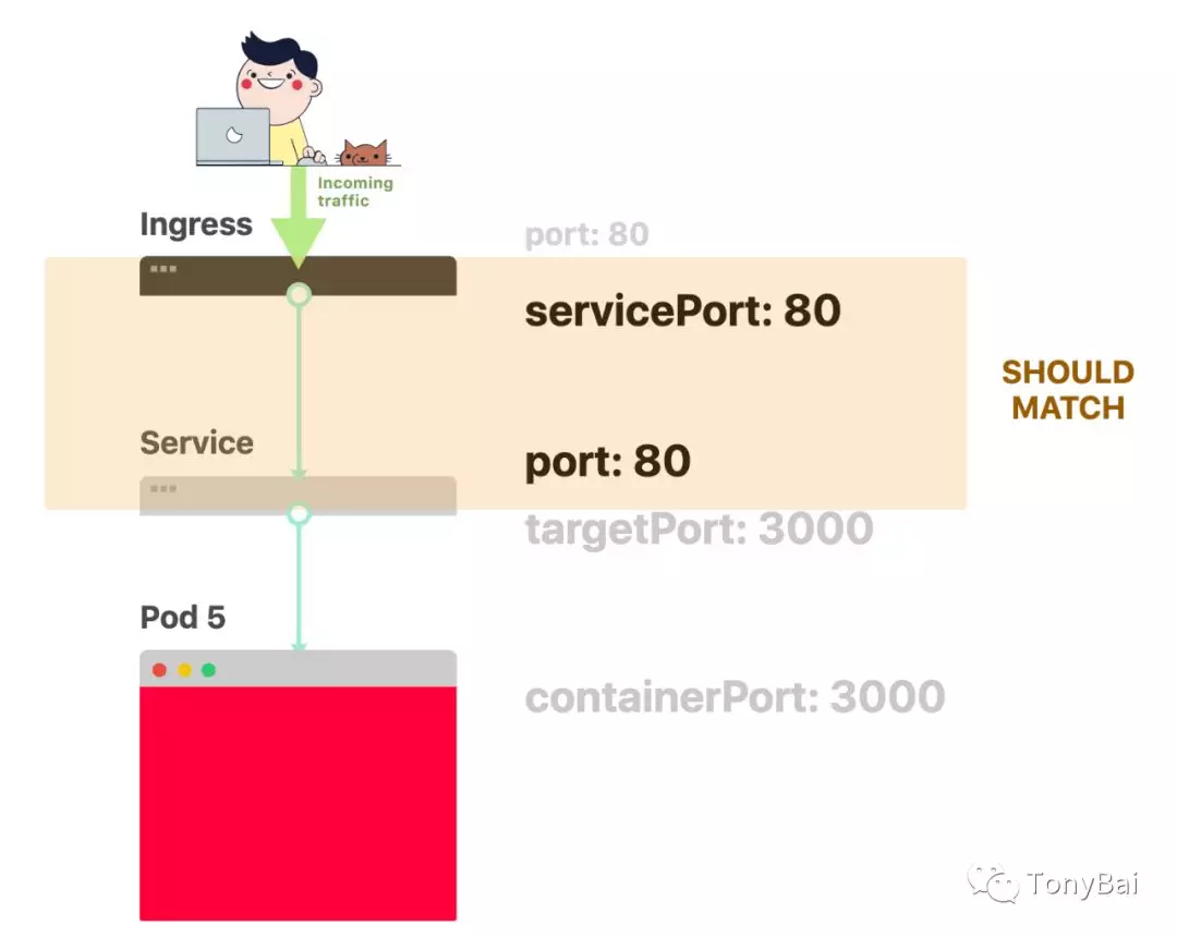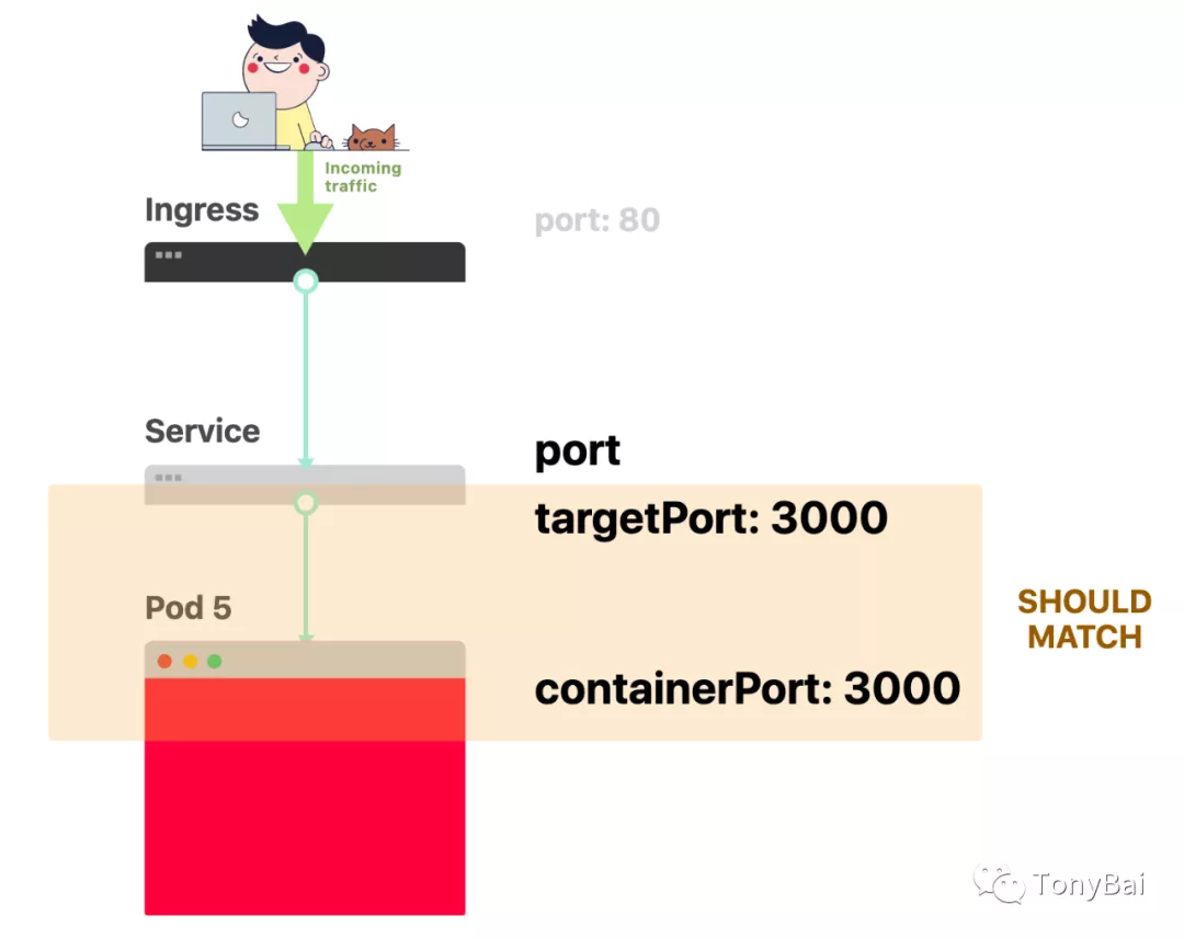 如果容器暴露3000端口(containerPort),那么targetPort应该匹配这一个端口号 再来看看YAML,标签和ports/targetPort应该匹配: