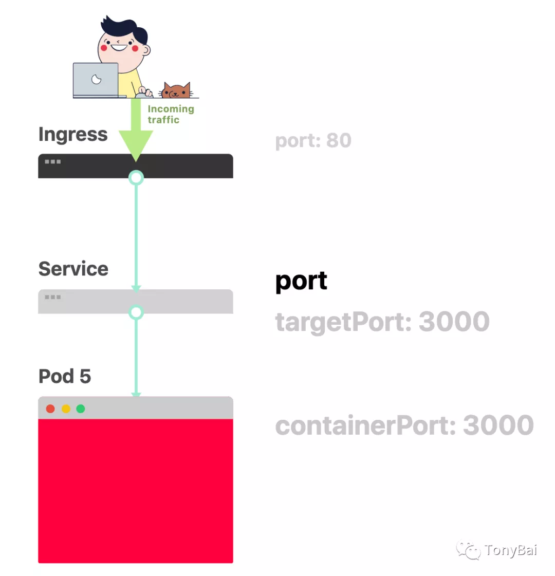 此时,每次你访问计算机上的端口3000时,请求都会转发到Pod上的端口80。