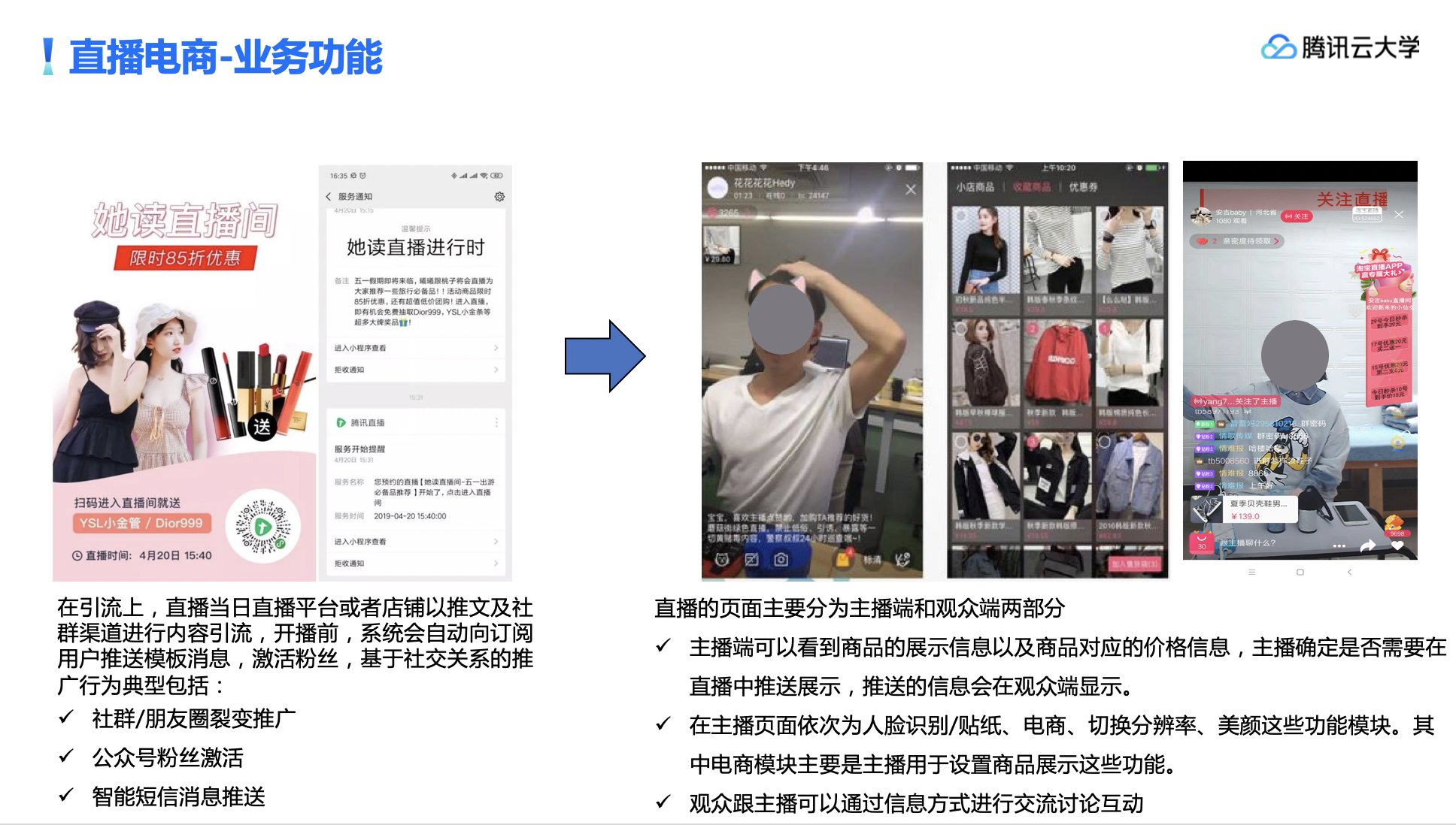 直播电商的业务形态是怎么样的呢?在引流上,直播当日直播平台或者店铺以推文及社群渠道进行内容引流,开播前,系统会自动向订阅用户推送模板消息,激活粉丝,基于社交关系的推广行为典型包括:社群/朋友圈裂变推广、公众号粉丝激活和智能短信消息推送。