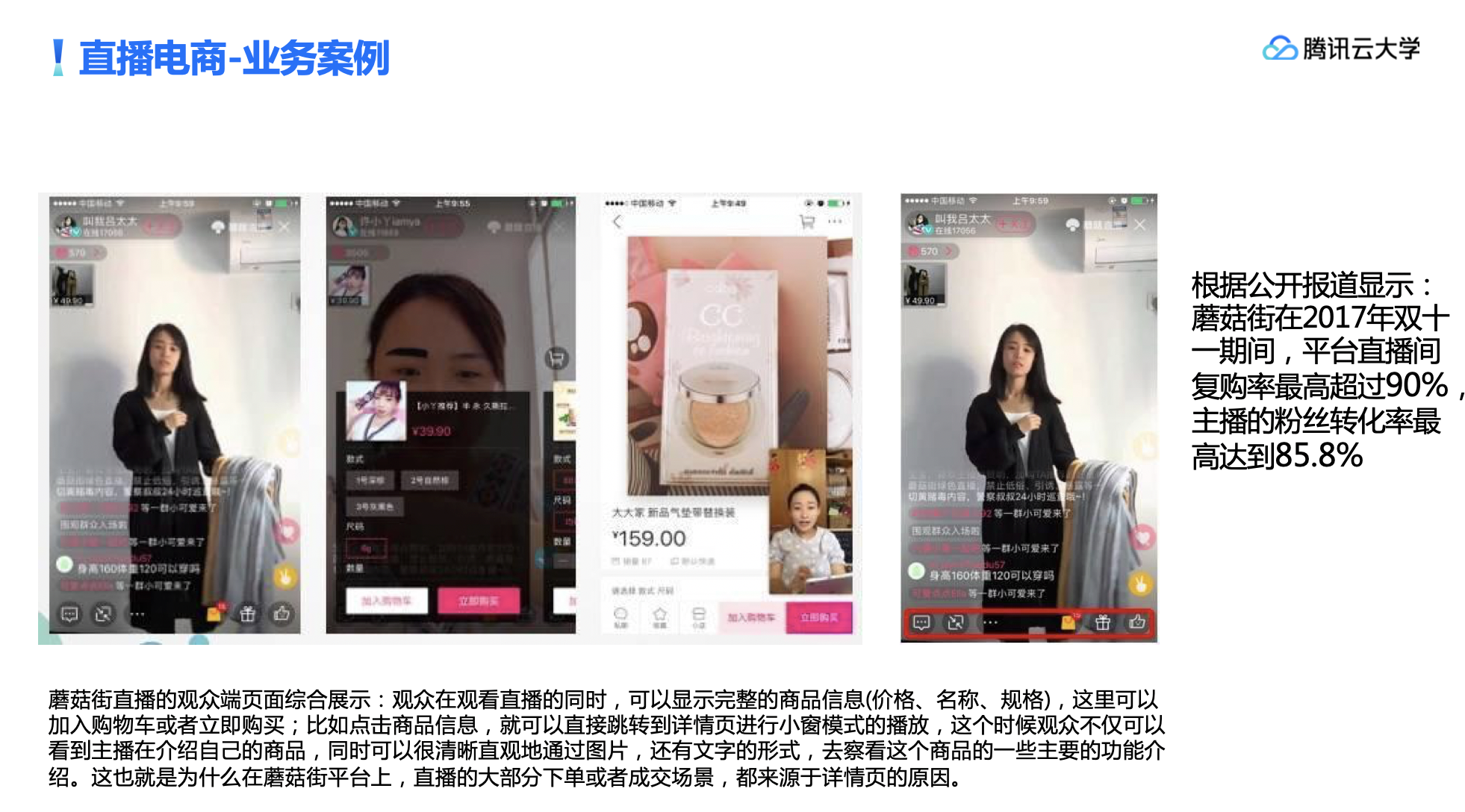 蘑菇街是直播电商中的一个比较典型的案例:蘑菇街的观众在观看直播时,观众在观看直播的同时,可以显示完整的商品信息(价格、名称、规格),这里可以加入购物车或者立即购买;比如点击商品信息,就可以直接跳转到详情页进行小窗模式的播放,这个时候观众不仅可以看到主播在介绍自己的商品,同时可以很清晰直观地通过图片,还有文字的形式,去察看这个商品的一些主要的功能介绍。这也就是为什么在蘑菇街平台上,直播的大部分下单或者成交场景,都来源于详情页的原因。