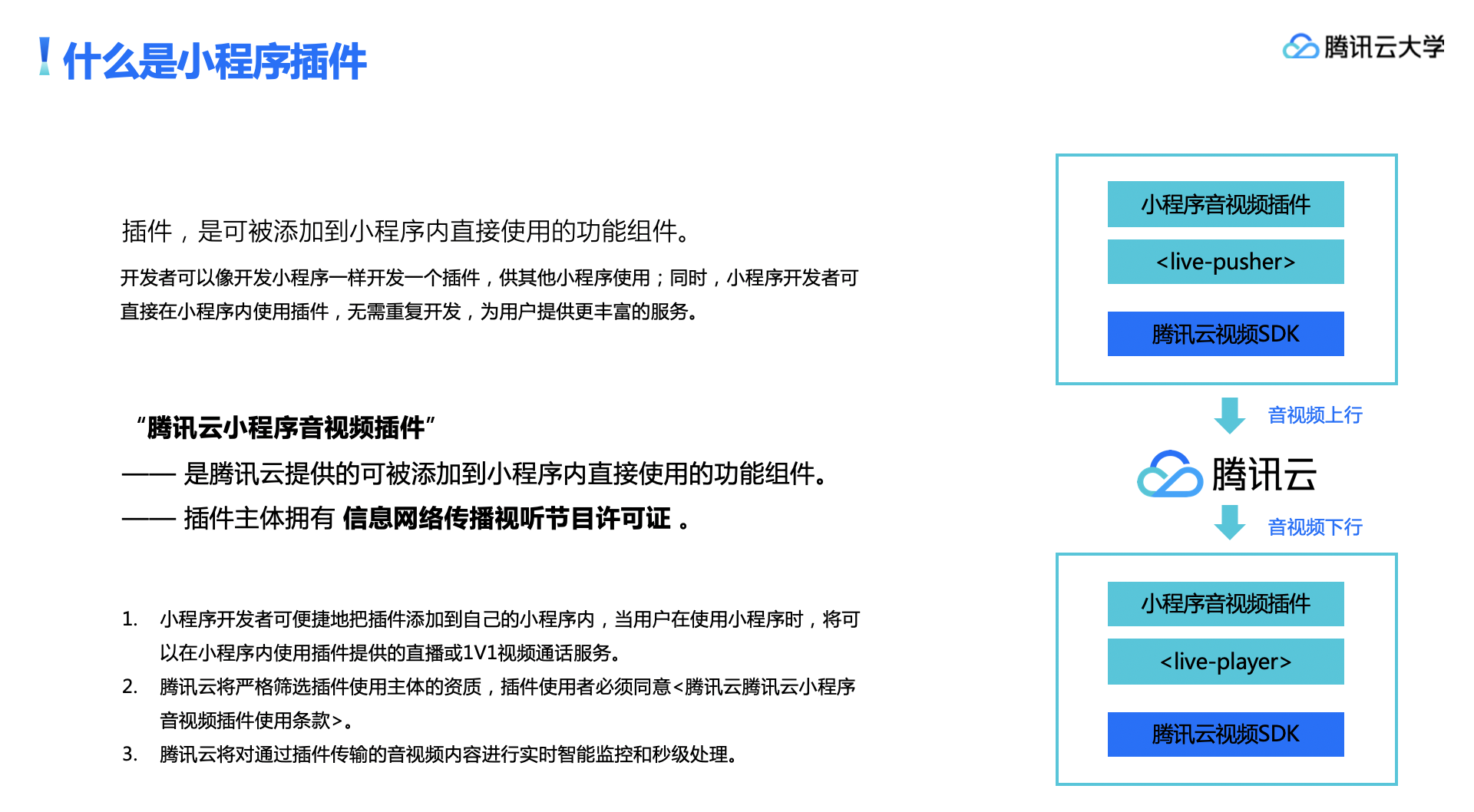 接下来介绍一下腾讯云研发的商业直播解决方案,这个方案依托插件对腾讯云云直播能力的封装,并结合云端的人工审核,能尽可能地帮助开发者减少业务对接的难度和风险。
