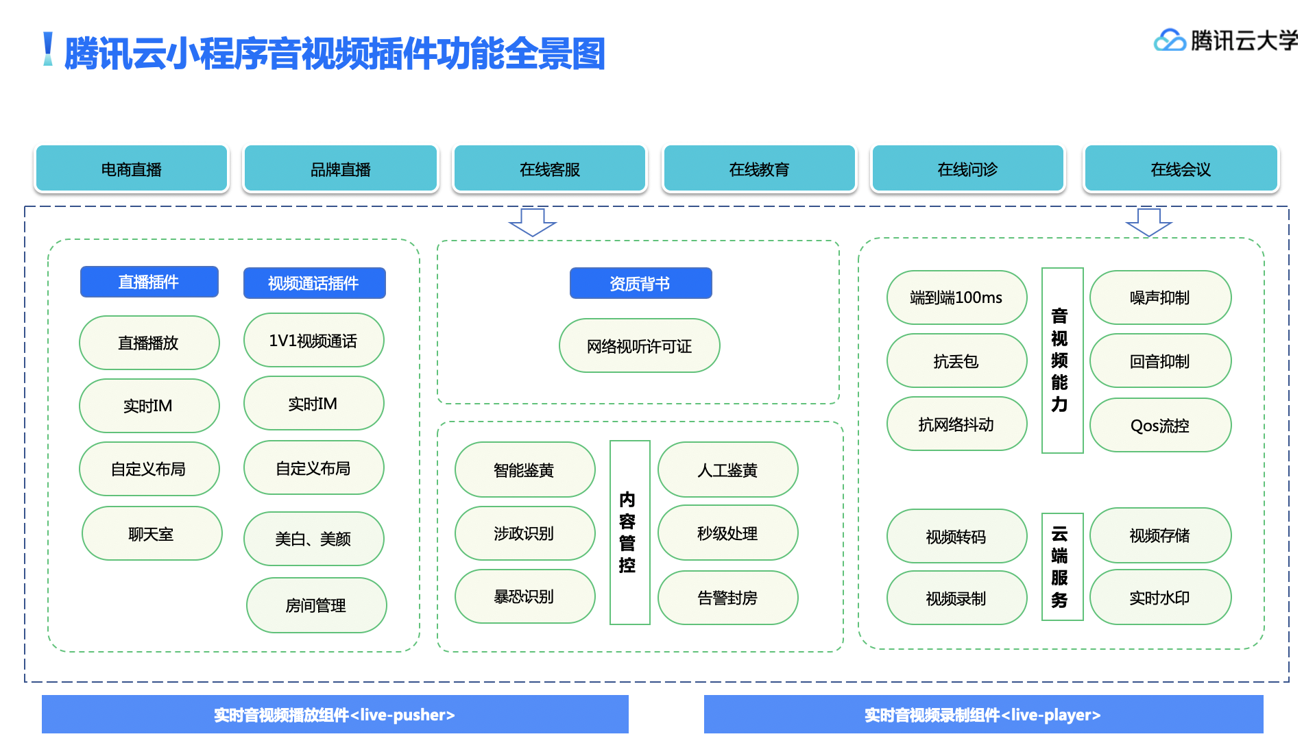 以下是小程序音视频插件功能的全景图。插件可以应用到很多场景中,除了电商直播以外,在线教育、在线客服和在线会议等场景都能依托这个插件来实现。插件当中有一个资质背书,这是帮助开发者和品牌降低做直播的门槛的关键。插件接入是第一步,解决了在小程序端调用底层音视频能力的问题。