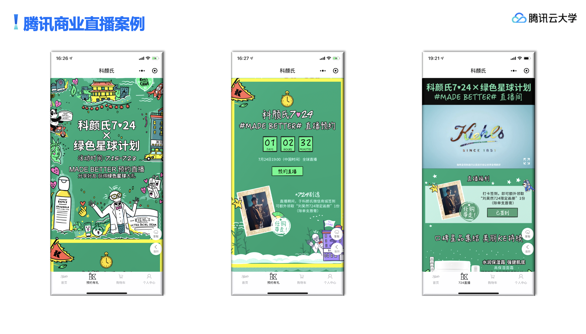 下图是腾讯商业直播和科颜氏合作的具体案例。2019年7.24,科颜氏Made Better绿色星球计划正式启动,通过科颜氏直播小程序直播呼唤观众关注环境与公益的公民精神,传播可持续的绿色生活方式。科颜氏直播小程序由腾讯视频云提供底层音视频插件,上海圣岚广告有限公司提供活动策略和落地。