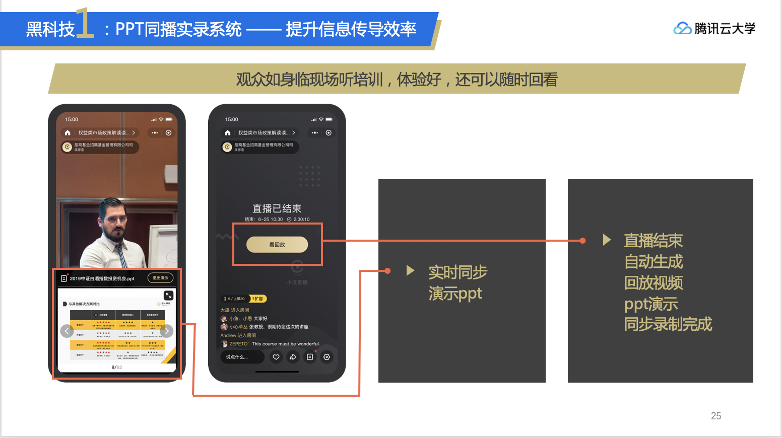 观众点击小程序,一点即听,驻留微信,下拉微信可复看;无需下载注册,渠道经理也可随手开播,扩大培训影响面。
