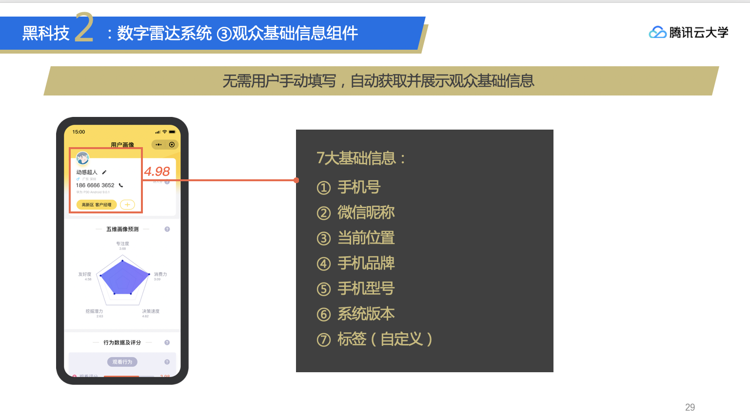 ②五维画像预测系统。基于用户个人信息、历史行为数据等,通过小匠AI机器人和大数据,计算生成的特征画像预测,囊括了观众的“个人特征”和“消费特征”,主要包括以下5个维度: