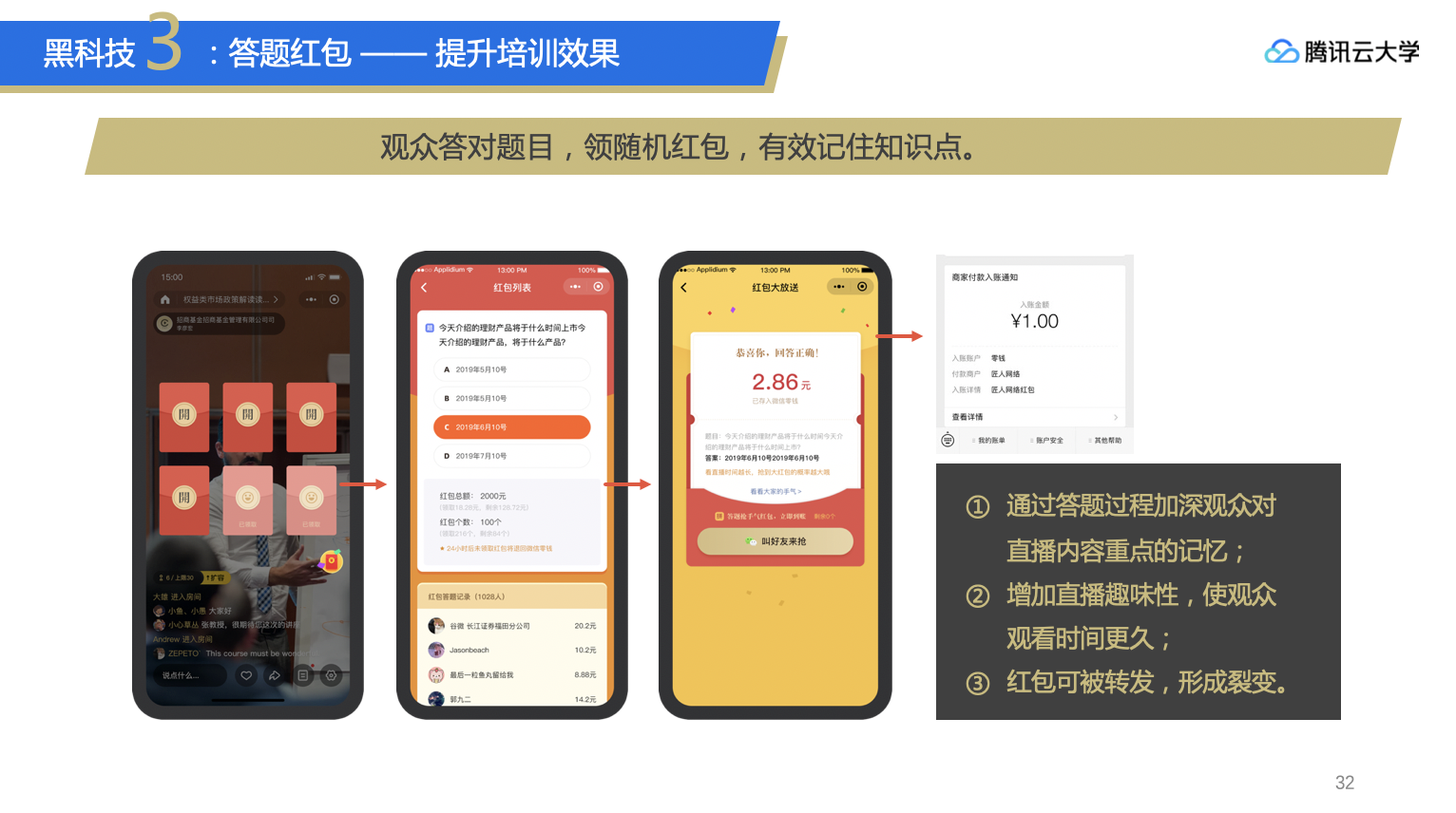 黑科技3 :答题红包 —— 提升培训效果。观众答对题目,领随机红包,有效记住知识点。