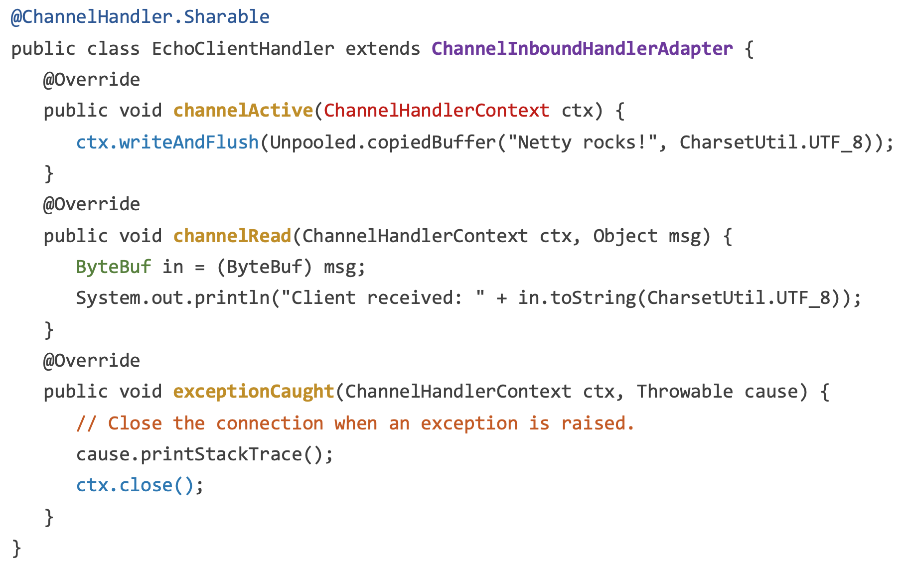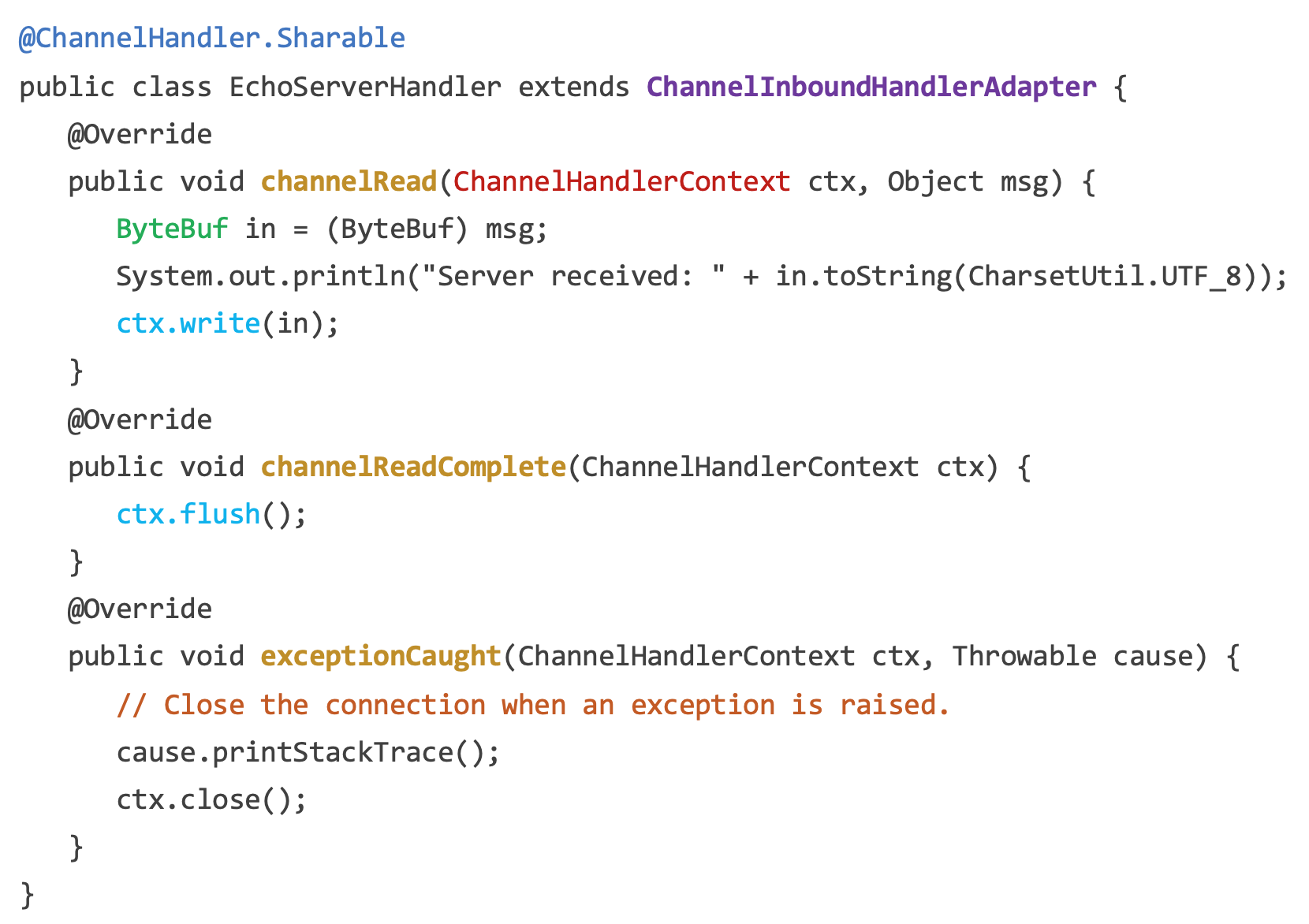 - @ChannelHandler.Sharable 声明该Handler无状态,可用于多个Channel的处理