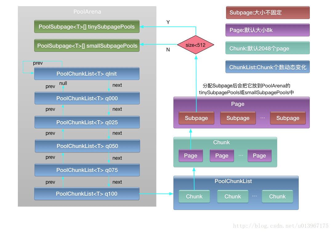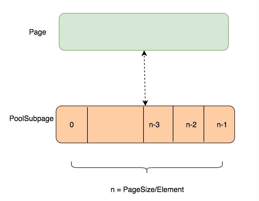 对于不足一个pagesize大小的内存分配,则由PoolSubpage进行处理,每一个PoolSubpage都会与PoolChunk里面的一个叶子节点映射起来, 然后将PoolSubpage根据用户申请的ElementSize化成几等分, 之后只要再次申请ElementSize大小的内存, 将直接从这个PoolSubpage中分配 (添加到PoolArena对应的SubPagePools中)。