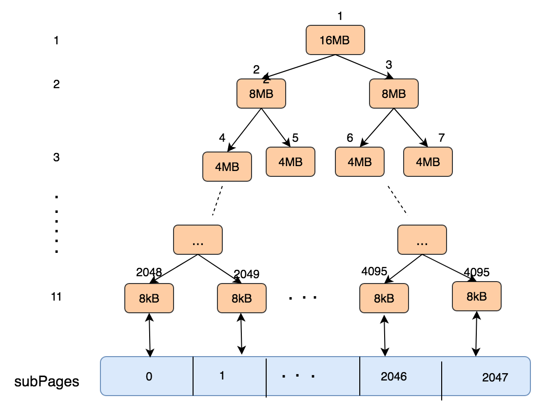 该二叉树将PoolChunk分11层, 第一层为1个16M, 第二层为2个8MB,第三层为4个4MB的内存块, 直到第11层为2048个8KB的内存块, 8kb的内存块称之为page。