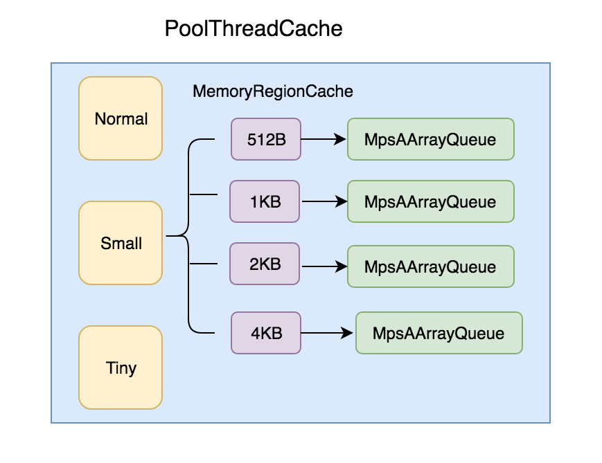 PoolThreadCache的内存来自于当前线程释放的。 PoolThreadCache也是将内存按大小分为tiny、small和normal三种,包含三个MemoryRegionCache数组(按照内存大小可快速定位),每个MemoryRegionCache都有一个Queue(固定大小)队列保存封装的Entry实体对象。