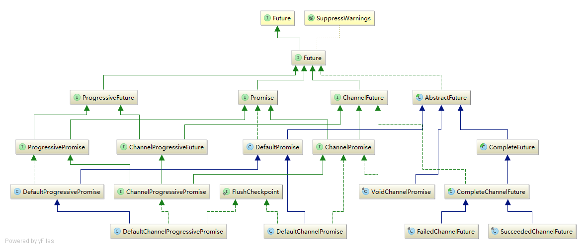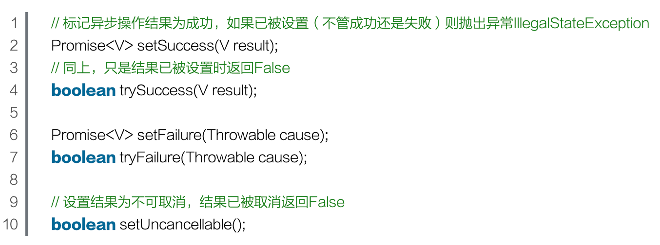 Promise 接口继承自 Future 接口,它提供的 setter 方法与常见的 setter 方法大为不同。Promise 从 Uncompleted 到 Completed 的状态转变有且只能有一次,也就是说 setSuccess 和 setFailure 方法最多只会成功一个,此外,在 setSuccess 和 setFailure 方法中会通知注册到其上的监听者。