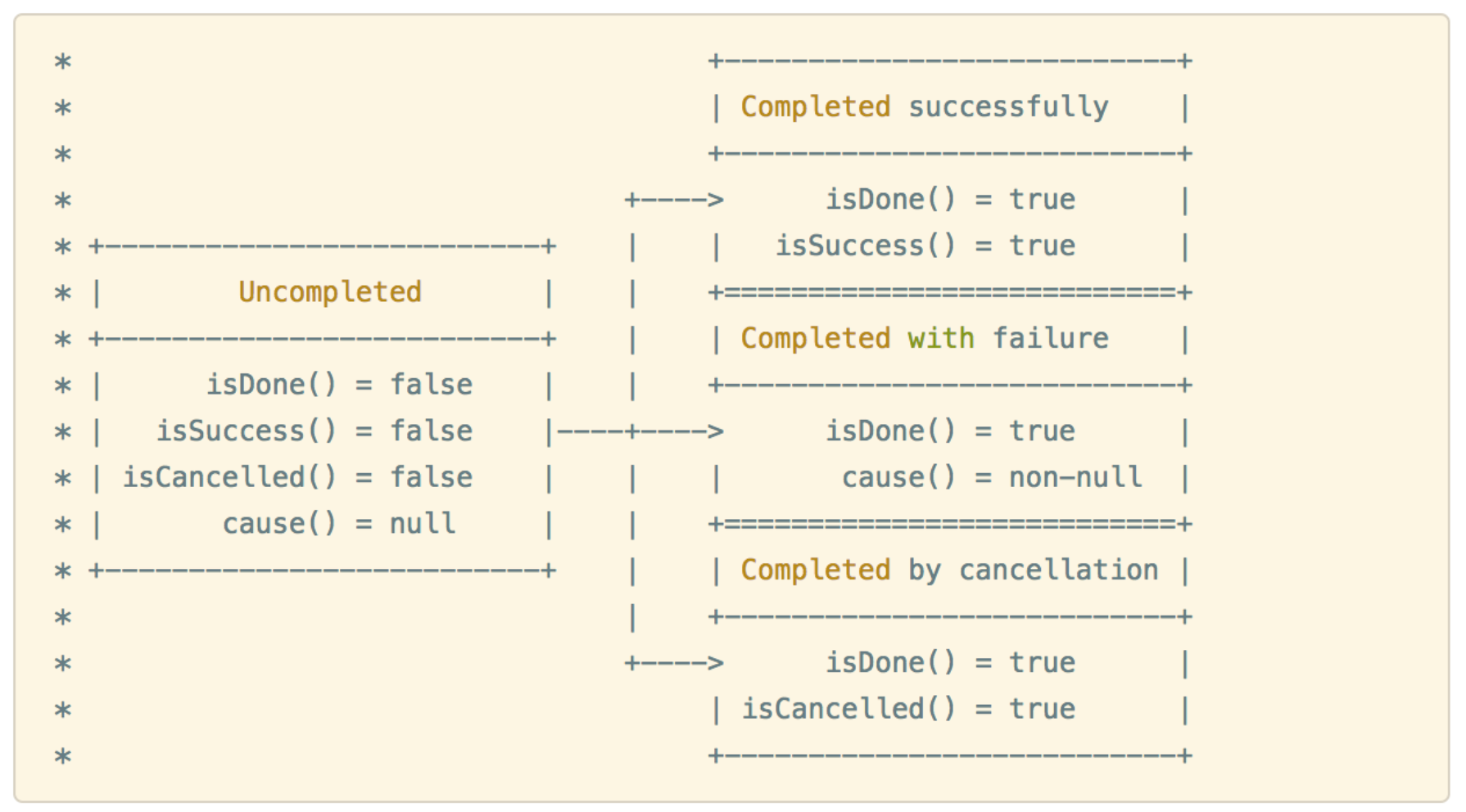 Future 对象有两种状态尚未完成和已完成,其中已完成又有三种状态:成功、失败、用户取消。