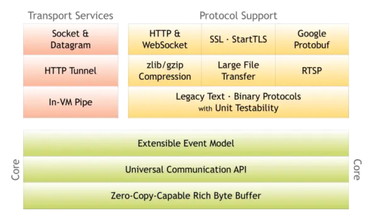 - Core核心模块 灵活且可扩展的事件模型 统一的传输层API 零拷贝的字节缓冲区