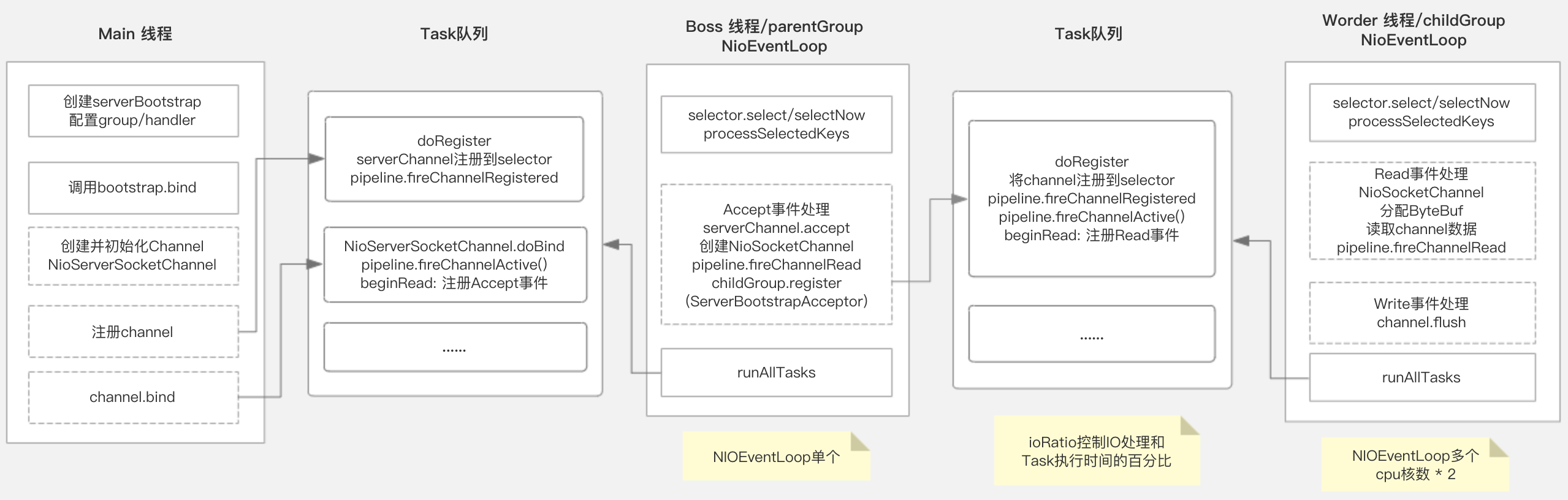 - workerGroup 处理通道IO读写事件 (机器核心数 * 2)