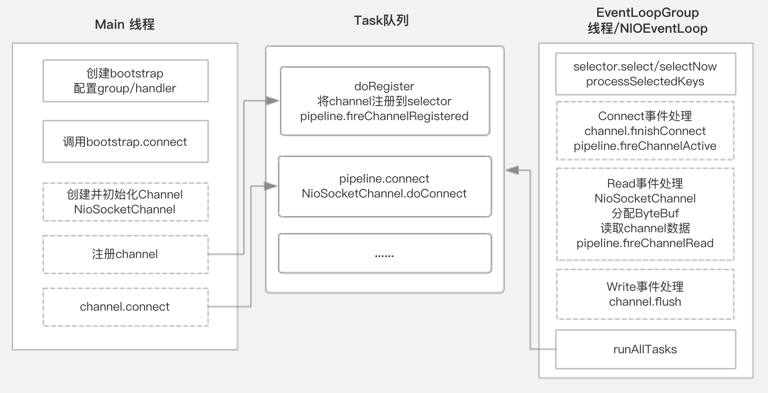 NioEventLoopGroup包含多个NioEventLoop,每个NioEventLoop表示单个线程的EventExecutor,内部维护一个待执行队列,关联多路复用器Selector,内部线程负责处理NIO事件和执行任务。