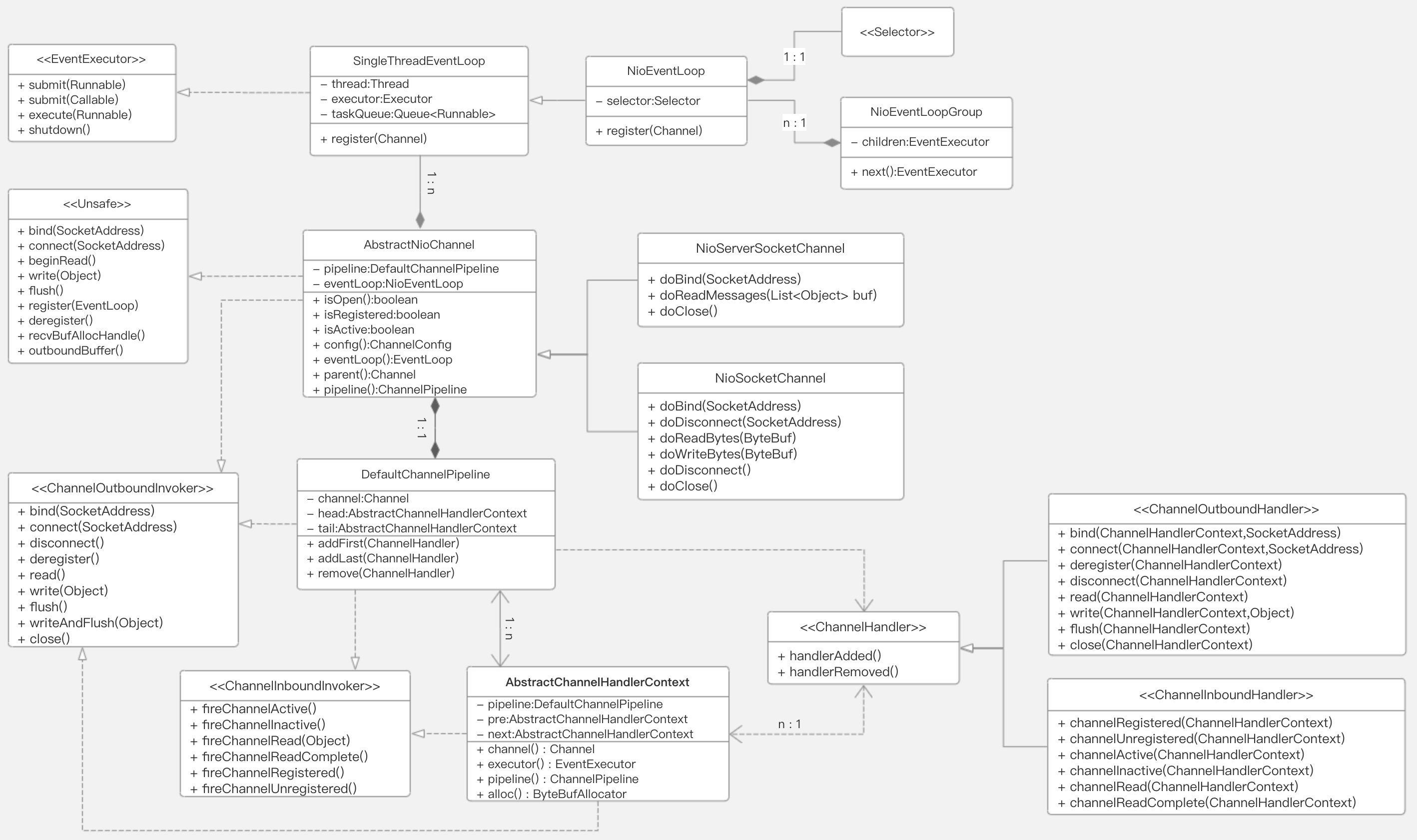 NioServerSocketChannel 和 NioSocketChannel 是对Java NIO的 ServerSocketChannel 和 SocketChannel的封装,内部包含其实例,都继承自AbstractNioChannel,并且实现了Unsafe(内部channel方法)和ChannelOutboundInvoker(下行事件触发/主动操作)接口。