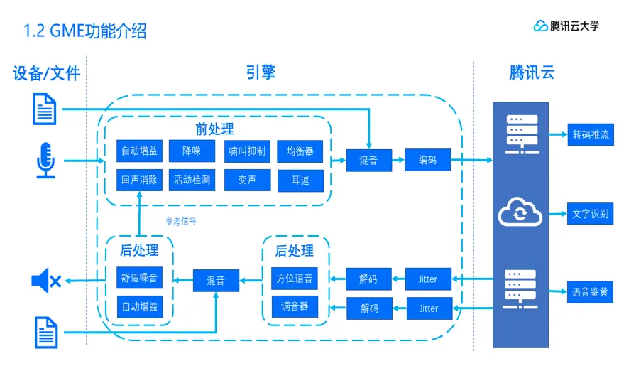 以下为GME整体功能全景图,我们可以看到GME里包罗万象,涵盖了常见的所有音频能力。本次课程主要介绍网络部分,包括语音上行过程中的编码和下行过程中的解码及网络上行过程中的各种抗丢包,抗抖动策略。