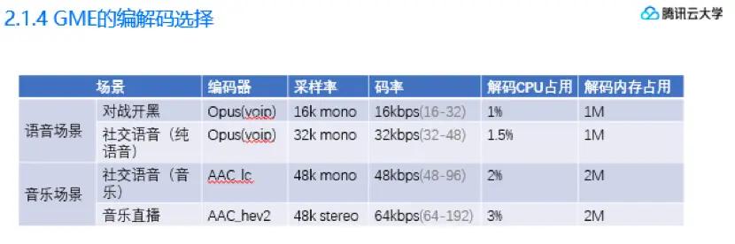 当然如果用户对消耗不那么看重,或者说像狼人杀这种语音就是游戏本身,我们也支持超宽带编码,可以完美的还原人声。在国战指挥场景下,因为很多玩家都喜欢播一点战歌,如果场景带音乐我们选择使用AAC_lc进行音乐编码,码率也同步提升到48k,但同时编解码消耗也将上升。最后是音乐纯直播的高音质场景,我们使用音乐效果最好的AAC_hev2,码率上限也大大提升。