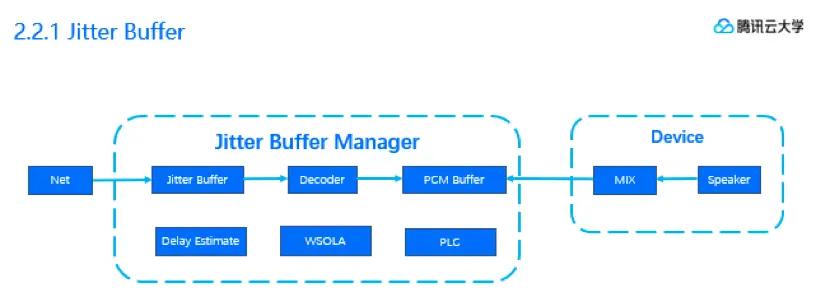 这个模块主要负责的是一个队列平衡。既不能让队列满(这样会形成丢包/跳帧),又不能让队列空(这样会形成播放静音帧)。