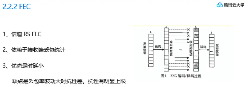 自动重传最大毛病就在于,RTT过大的场景下可用性会极度的降低,因为很多丢包都会因为重传时间超过了播放缓存,而无法触发重传。另一个缺点是缺乏拥塞机制,在拥塞丢包时会让拥塞更加严重。