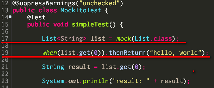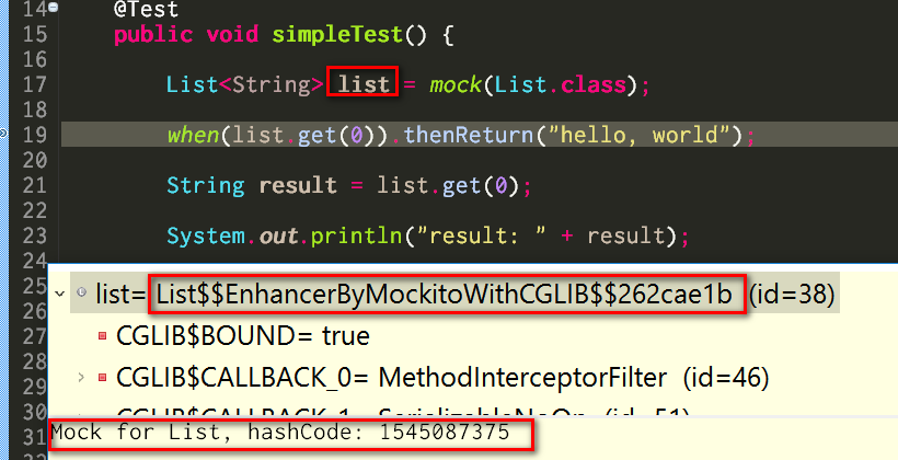 In debugger you can find that the variable in line 17 is mocked by CGLIB: